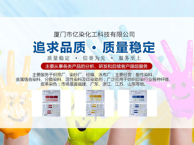 廈門市億染化工科技有限公司是一家集研發、生產、銷售一體的綜合型企業。公司主要經營:酸性染料、金屬絡合染料、高牢度分散染料及印染助劑。公司信守“以誠信贏合作、以質量贏市場、以創新贏發展、以服務贏生存”的企業精神服務于廣大客戶,多年以來建立了良好的市場口碑,市場遍布福建、廣東、浙江、江蘇、山東及東南亞國家,與多家知名企業建立了長期合作伙伴關系!